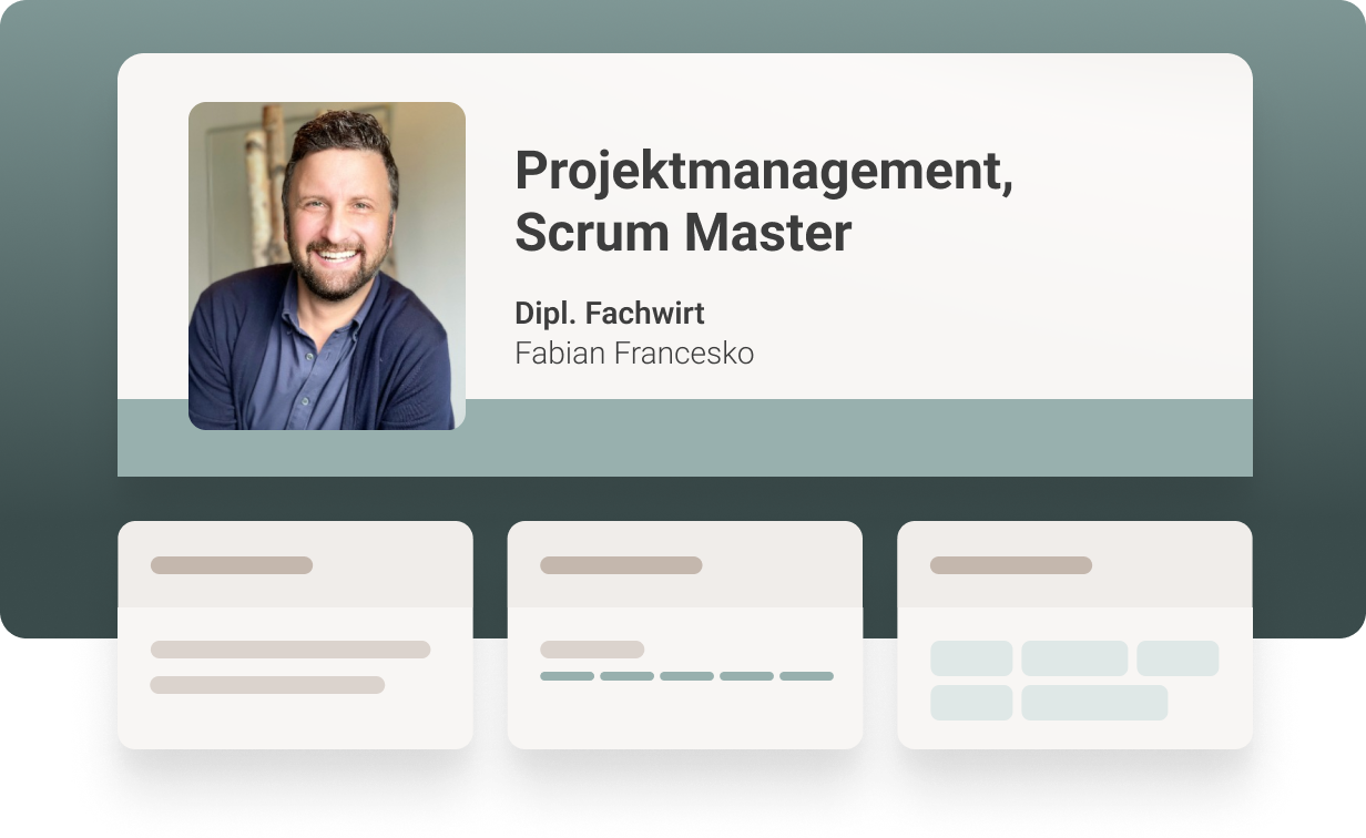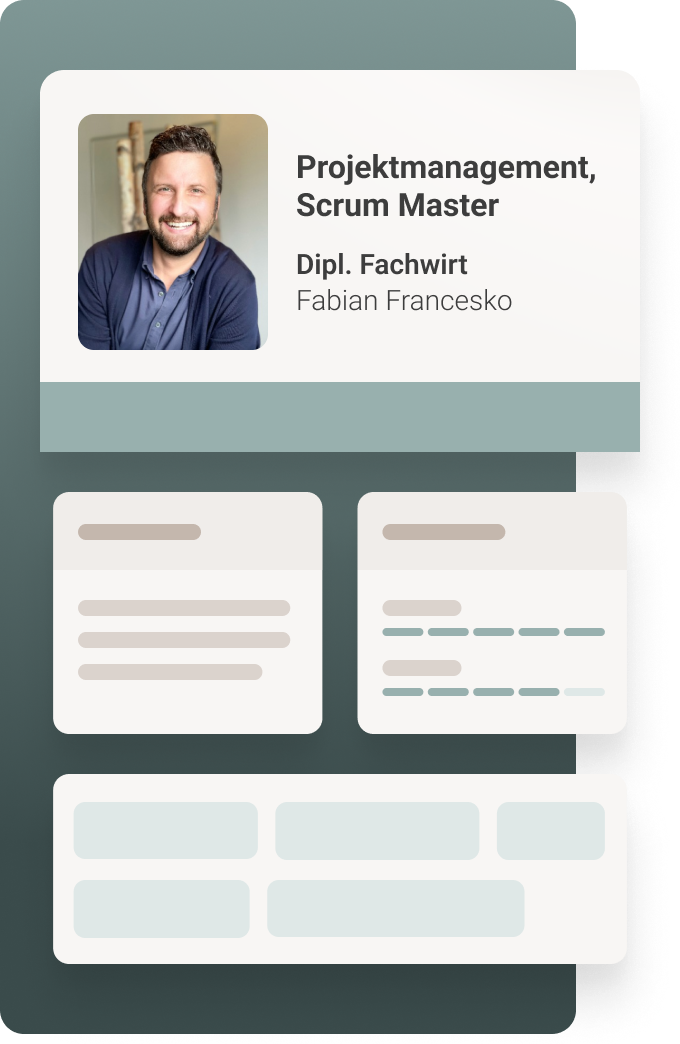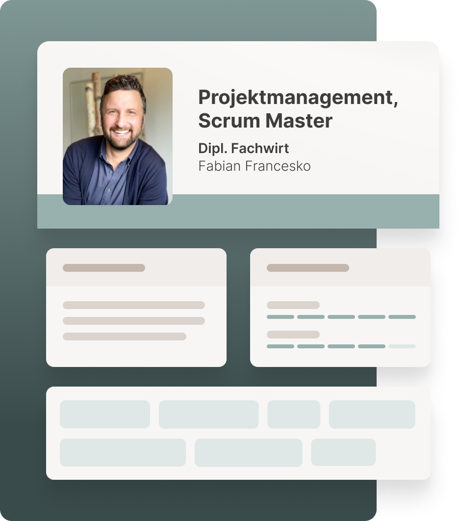 Mit übersichtlichen Mitarbeiterprofilen in Ihrem ganz individuellen Design. Diese können Sie entweder klassisch als Anlage verschicken oder Ihren Kunden als aufbereitete Website zur Verfügung stellen. So helfen wir dank Schnelligkeit und einem professionelleren Erscheinungsbild unseren Kunden dabei, den Zuschlag für Projekte zu erhalten!